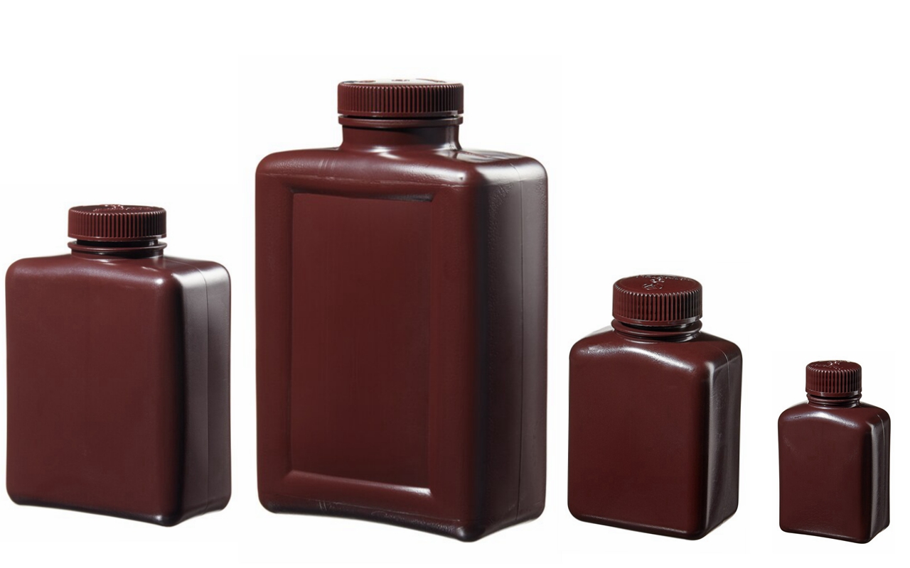 Thermo Scientific™ Nalgene™ 琥珀色 HDPE 矩形瓶比传统的圆瓶更节省空间。