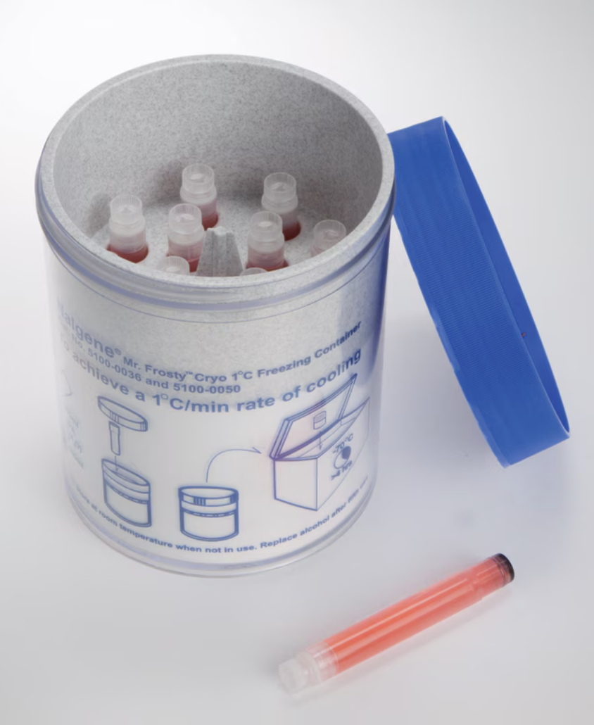 使用 Thermo Scientific™ Mr. Frosty™ 梯度降温盒在 1 至 5 mL 试管中冷冻细胞。