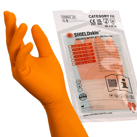 SHIELDskinTM ORANGE NITRILETM 300 Sterile 橙色无粉丁腈手套灭菌款 300mm(11.8 in),厚度0.14mm(5.5mil),AQL 0.25